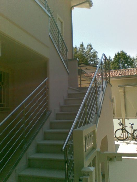 I parapetti delle scale sono stati realizzati in acciaio inox, pensati per garantire solidità, durabilità e continuità estetica con gli altri elementi in metallo.