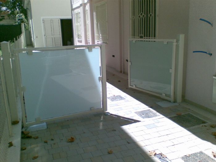 I cancelli sono stati completati con vetro acidato, integrando trasparenza e sicurezza in modo elegante e funzionale.