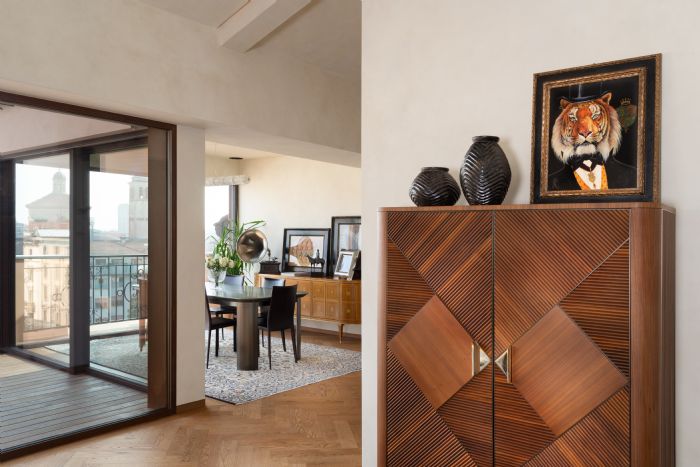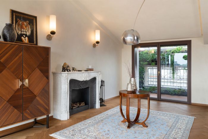 In questo attico plurifamiliare abbiamo installato infissi minimal in alluminio Schuco serie AWS.90.BS.SI e scorrevoli Seccosistemi seire OS2 AS.75 in acciaio corten, con vetri tripli extrachiari e acustici, per garantire luminosità e comfort termico.