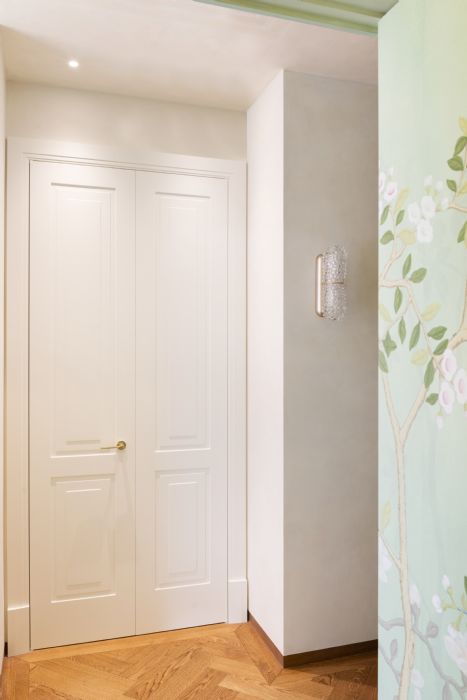 Queste modifiche hanno alleggerito molto la vista di insieme e reso meno impattante i binari a pavimento. Di fatto l'infisso così composto di integra perfettamente con il bellissimo pavimento a spina e le parteti circostanti.