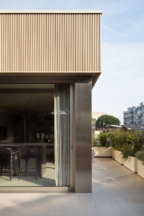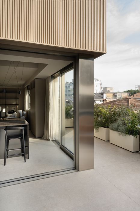 Uno degli elementi più iconici di questo intervento è lo scorrevole ad angolo nell’attico, che collega la cucina con l’ampio terrazzo esterno, dove trova posto una vasca idromassaggio. Per una perfetta continuità tra interno ed esterno, abbiamo installato guide perfettamente incassate nel pavimento con soglia “zero level”, eliminando ogni barriera architettonica. Una scelta ideale per un’abitazione al mare, dove si cammina spesso scalzi e il comfort diventa essenziale.