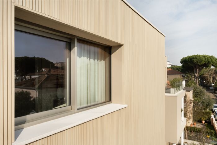 Il cliente desiderava sicurezza, comfort e un impatto estetico raffinato. Da qui la scelta di infissi in alluminio a taglio termico Schüco, con finitura champagne spazzolato, perfettamente in armonia con il rivestimento esterno TWIX color tortora. Un connubio cromatico che esalta il carattere dell’edificio, rendendolo un’icona di eleganza e funzionalità.