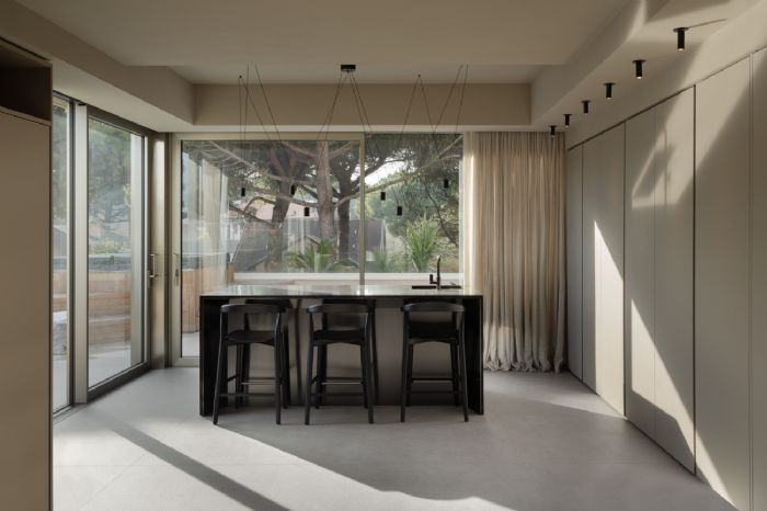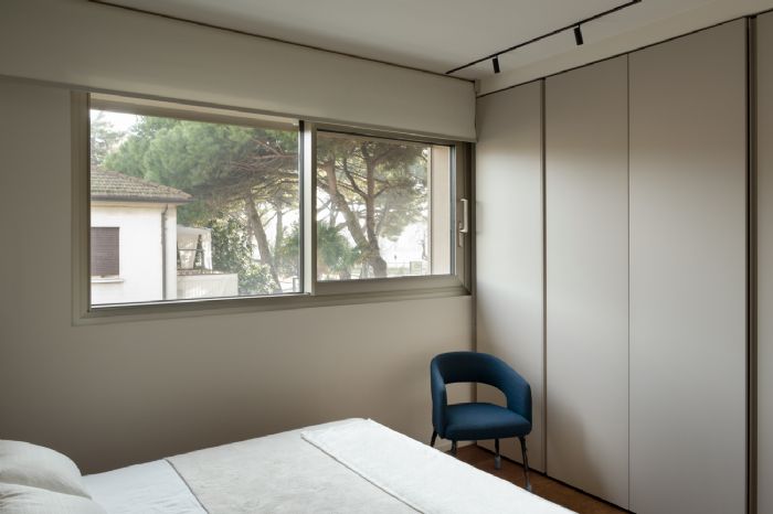 - Infissi scorrevoli: Per le ampie aperture, sono stati utilizzati scorrevoli Schüco ASE.80.Hi nella versione "Design Edition", caratterizzati da un montante centrale di soli 4 cm. Questa scelta consente di massimizzare la superficie vetrata, favorendo la luce naturale e creando una connessione fluida tra interno ed esterno.