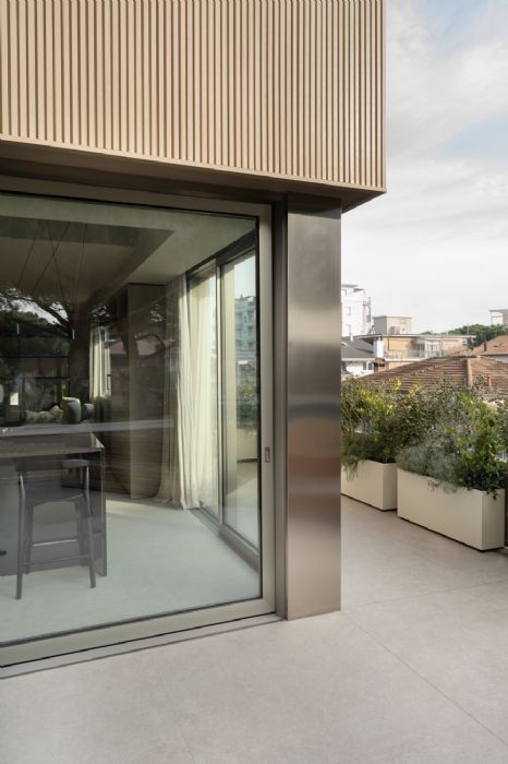 - Finitura champagne spazzolato, una richiesta specifica del cliente che unisce eleganza e resistenza. Essendo l’edificio situato a pochi passi dal mare, la finitura ossidata garantisce una protezione superiore contro la corrosione e il deterioramento nel tempo, assicurando un’estetica sempre impeccabile.